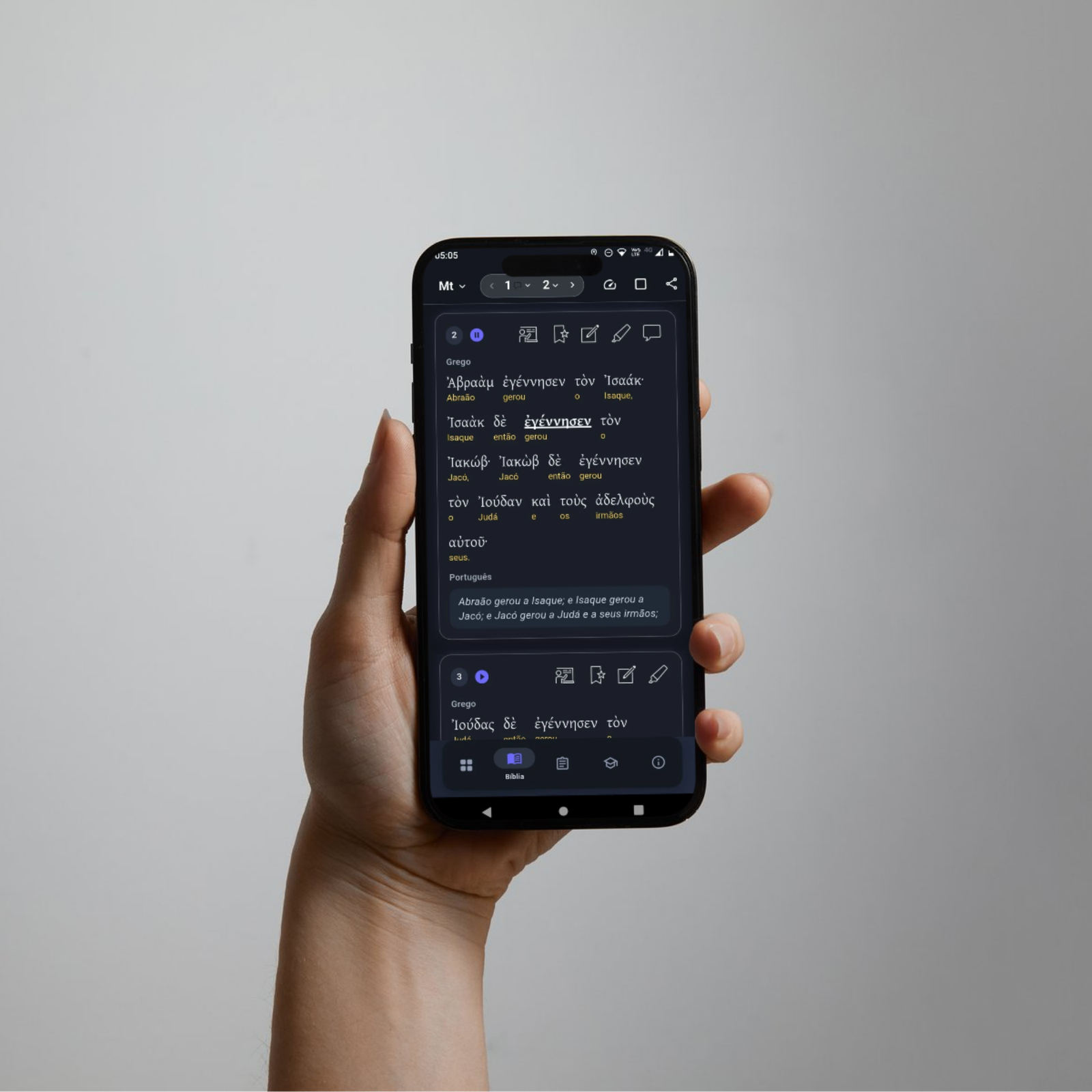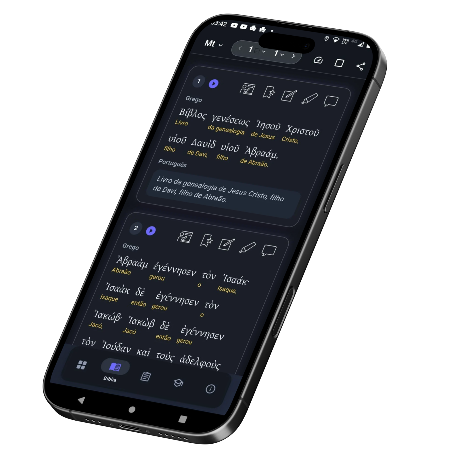 A Bíblia Ekklesia entrega leitura no grego koiné (grego antigo) com pronúncia erasmiana para acelerar o aprendizado real. Também oferece assistente virtual para responder dúvidas versículo por versículo e uma plataforma completa para estudo profundo.